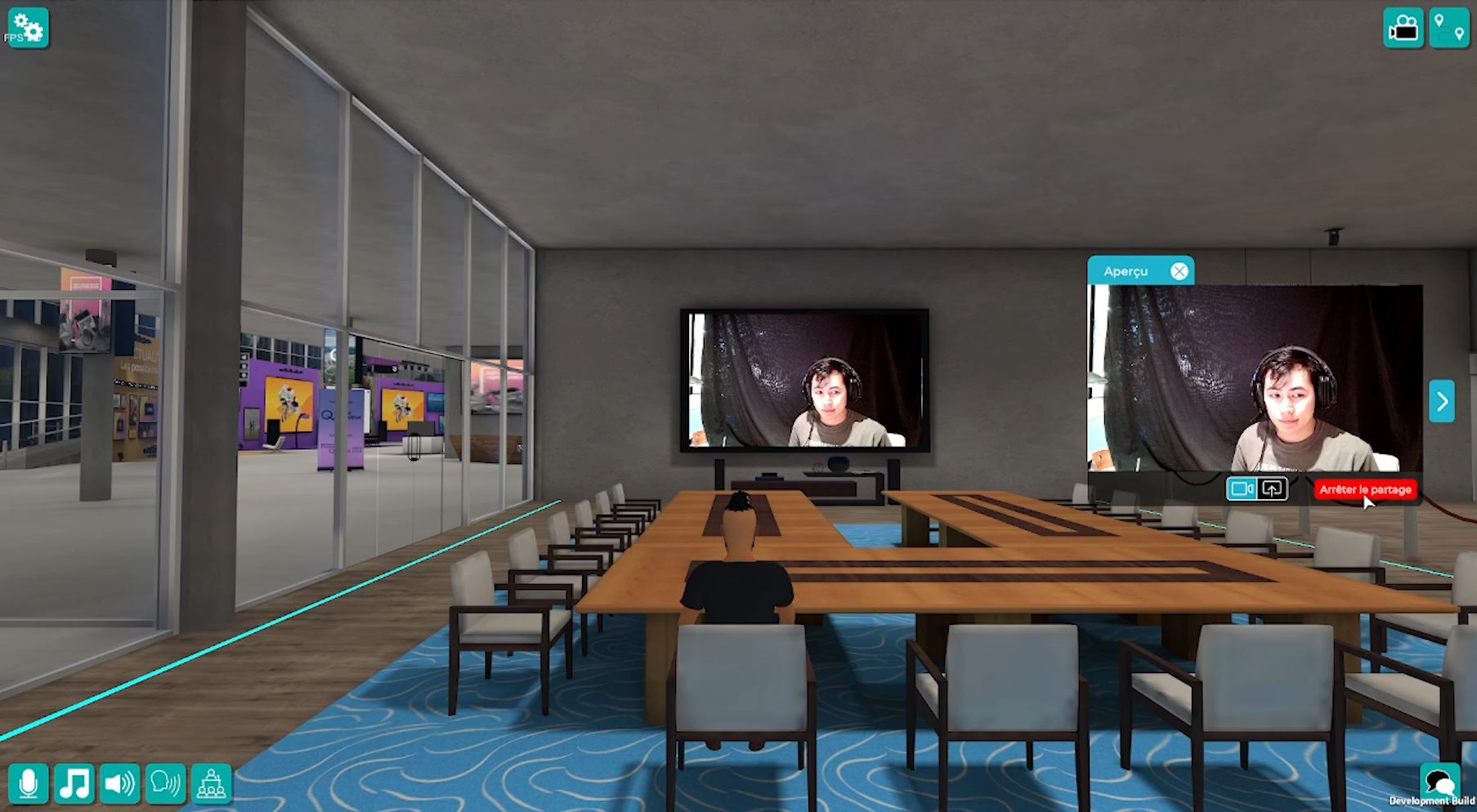 Tout comme les plateformes de visioconférence traditionnelles, la Virtual Zone permet le partage d’écran et de caméra. Cette option est accessible aux administrateurs et aux présentateurs.